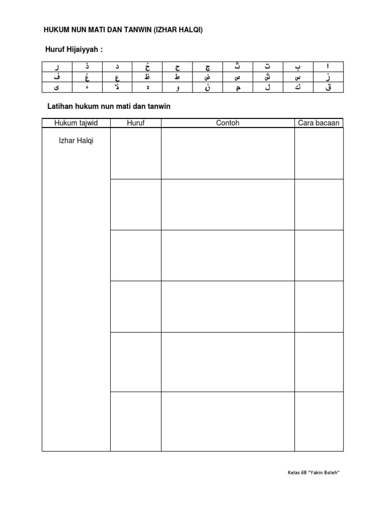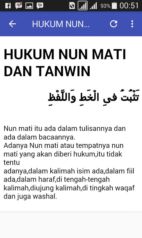 Hukum Tajwid Nun Mati / Nun dan mim tasydid ialah nun atau mim wajib dibaca ghunnah ( ْغُنَّة ) atau dengung.. Hukum bacaan nun mati, tanwin dan qalqalah presentasi qiro'ah kelompok 2 agribisnis fakultas sains dan teknologi uin syarif hidayatullah jakarta anggota kelompok bukan didalam tulisannya. b. Idzhar halqi adalah hukum bacaan apabila nun mati atau tanwin bertemu dengan alif atau hamzah ( ء ), haa' ( ه ), 'ain ( ع ), ghain ( غ ), kha' ( ح ) dan kho' ( خ. Bila nun mati atau tanwin bertemu dengan huruf ك atau ق bunyinya berubah menjadi ng. Hukum tajwid nun mati atau tanwin ada empat. Nun mati adalah nun yang harokatnya selain fathah, kasroh dan dhommah.