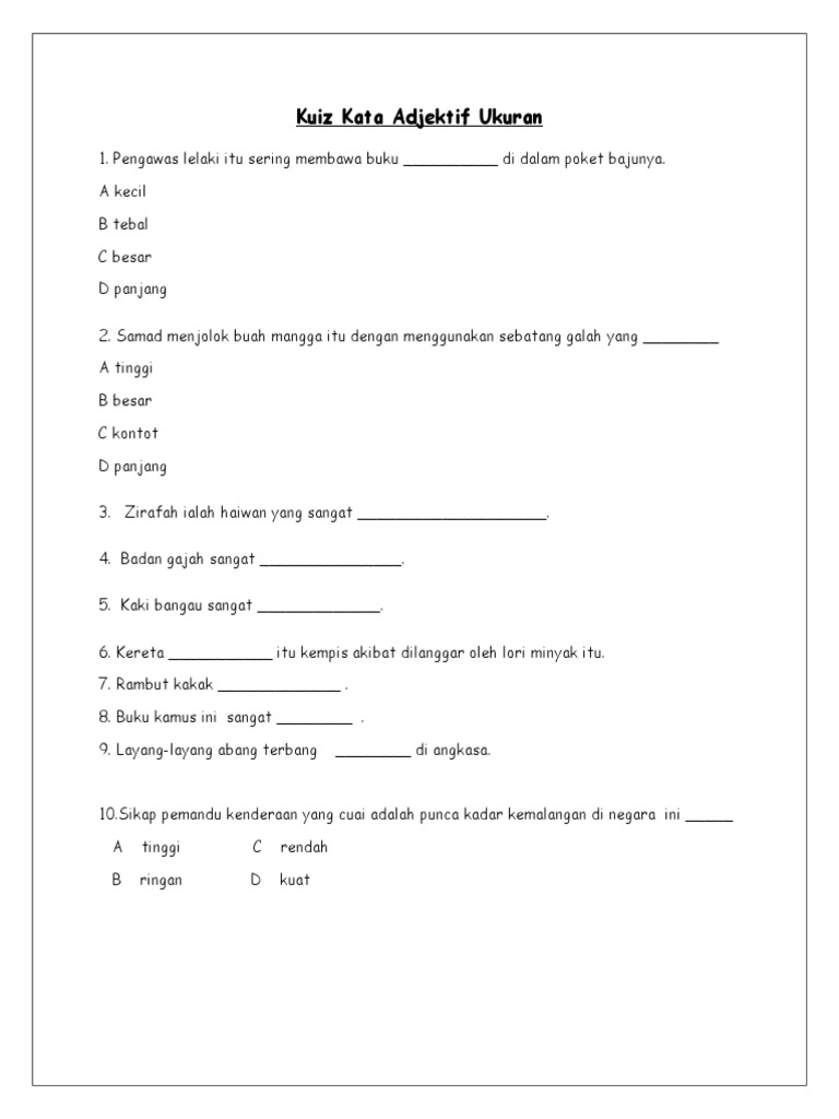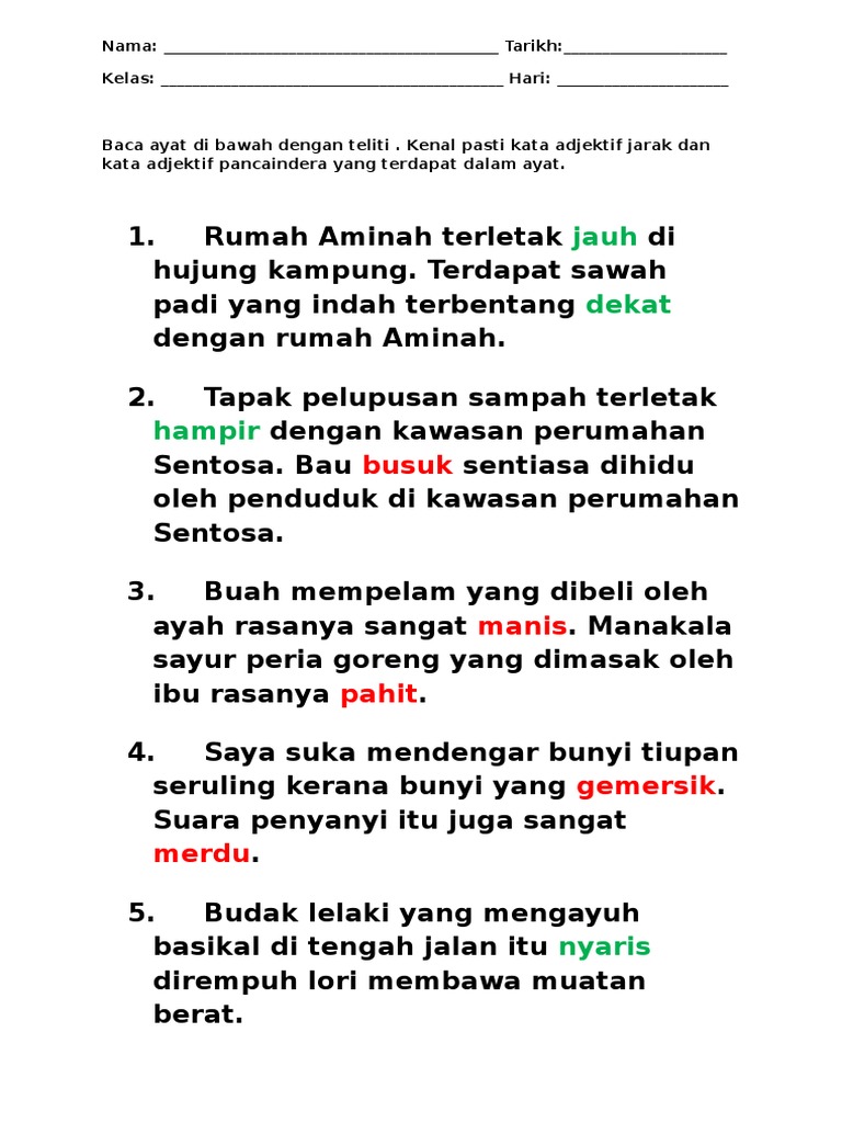 1 from Rumah siti terletak_ dari sini. Rujukan guru adalah melalui sp 5.1.5, iaitu memahami dan menggunakan kata adjektif dan kata bantu dengan konteks yang betul. Ayat dengan kata seru (5) ayat penyata (1). Memang tidak ada salahnya untuk memberi hadiah pada diri sendiri. Laman bahasa melayu kata adjektif. Lembaran kerja dan latiha membaca petikan mudah. 1.daging itu dihiris (tebal, nipis) agar cepat empuk. Puan hasnah membuang pinggan seramik yang.